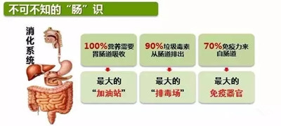肠道是人体主要的消化器官,人体所需的营养物质大约99%由肠道消化(另外1%左右的消化包括了口腔的机械性咀嚼和唾液淀粉酶对淀粉的分解等),100%靠肠道吸收。