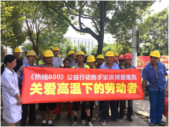 7月30日,《热线800》公益行动携手安庆市博爱医院开展“关爱高温下的劳动者”系列公益活动,安庆市博爱医院相继向天意物业的“环卫工人”、湖心路的“修路工人”、出租车司机、武警消防支队送上冰镇绿豆汤、矿泉水、西瓜、防暑药品等清凉物资,为炎炎夏日给坚守岗位的劳动者们送上了丝丝凉意,向劳动者致敬。